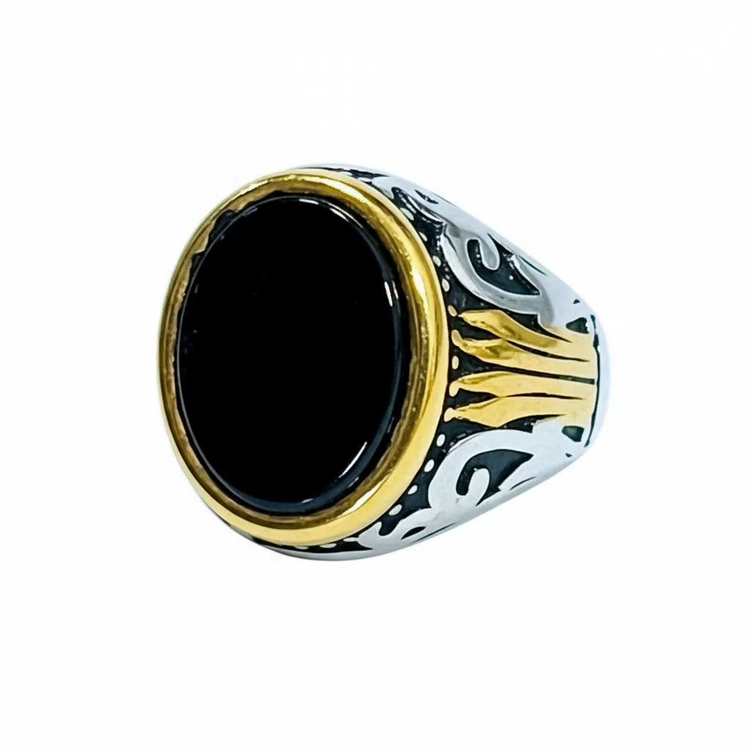 انگشتر مردانه دو رنگ با عقیق سیاه اصل - طرح اسلیمی سلطنتی که در مرکز آن نگین عقیق سیاه طبیعی (Onyx) با تراش بیضی و سطح کاملاً صیقلی و براق قرار گرفته که نماد قدرت، محافظت و آرامش درونی است.