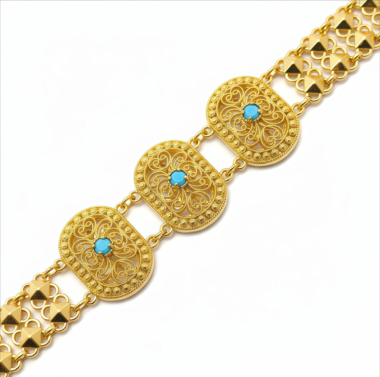 پلاکهای بیضی با طرح اصیل قاجاری و نگینهای فیروزه مصنوعی (رزینی) به رنگ آسمانی زنده که از دور کاملاً شبیه فیروزه طبیعی نیشابور به نظر میرسد.