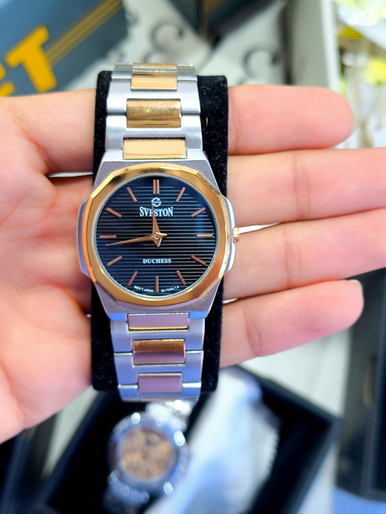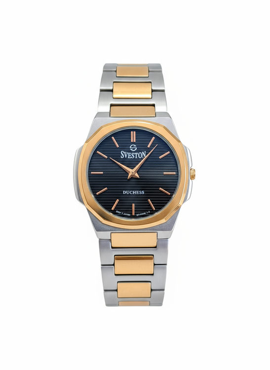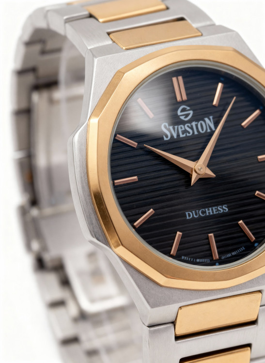 ساعت مچی سوستون مدل Duchess، با طراحی هشتضلعی مدرن و الهامگرفته از سبکهای کلاسیک، گزینهای ایدهآل برای خانمها و آقایان شیکپوش است. صفحه مشکی عمیق با عقربههای طلایی رزگلد و نشانگرهای ساده، ظاهری مینیمال و لوکس ایجاد میکند که با هر استایلی هماهنگ میشود.و بدنه و بند دو رنگ استیل ضدزنگ (نقرهای و طلایی) دوام و راحتی را تضمین میکند. ضدآب تا ۳۰ متر (۳ATM)، و مناسب برای استفاده روزانه یا هدیه ترکیبی از ظرافت و کیفیت عالی را به دستان شما هدیه میدهد