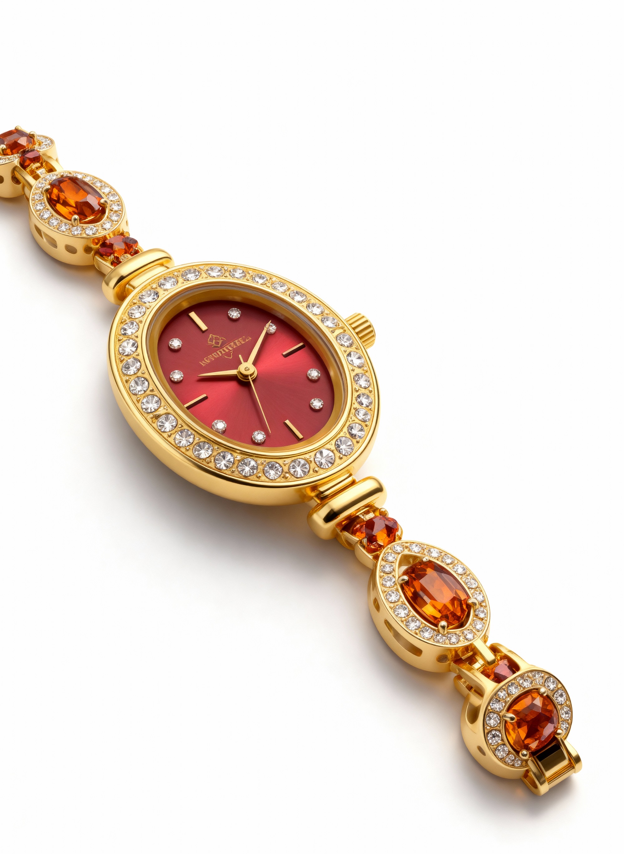 ساعت مچی فیتون (Fitron) اصل، یک شاهکار جواهرنشان با صفحه شرابی (Burgundy) و بدنه طلایی پر از نگین! این مدل خاص با بند جواهری گلدار و کریستالهای رنگارنگ، ترکیبی بینظیر از ساعت و دستبند لوکس است. مناسب برای بانوانی که میخواهند در هر لحظه بدرخشند – از قرارهای عاشقانه تا مجالس شبانه.