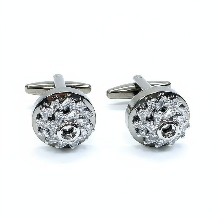 دکمه سردستهای استثنایی با طراحی الهامگرفته از چرخدندههای مکانیکی، نمادی از دقت مهندسی و زیبایی مدرن. بدنه از استیل ضدزنگ با روکش رودیوم مشکی براق ساخته شده و با کریستالهای مصنوعی شفاف سواروسکی (تراش بگت و برلیان) تزئین گردیده است.