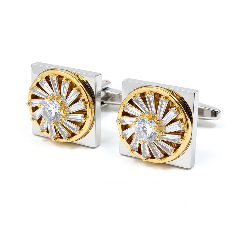 دکمه سردستهای دو رنگ با طراحی چرخ خورشیدی، ترکیبی از مدرنیته و شکوه کلاسیک. بدنه مربعی از استیل ضدزنگ با روکش رودیوم نقرهای براق و دایره مرکزی با کریستالهای سواروسکی در تراش بگت و برلیان تزئین شده است.