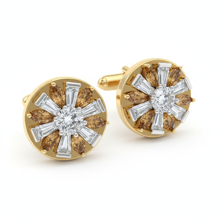 دکمه سردستهای گرم و مجلل با طراحی خورشید کاراملی، ترکیبی از رنگهای طلایی و قهوهای عسلی. مرکز هر قطعه با کریستال زیرکونیا شفاف (تراش برلیان) احاطه شده و پرتوها با کریستالهای سیترین مارکیز و بگت سفید سواروسکی تکمیل میگردد.