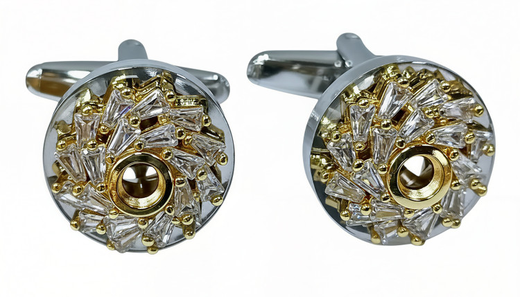 دکمه سردستهای صنعتی-لوکس با طراحی چرخدنده در حال حرکت، نمادی از دقت و زیبایی مکانیکی. بدنه از استیل ضدزنگ با روکش رودیوم نقرهای و مرکز چرخدنده طلایی با کریستالهای سواروسکی در تراش بگت و برلیان تزئین شده است.