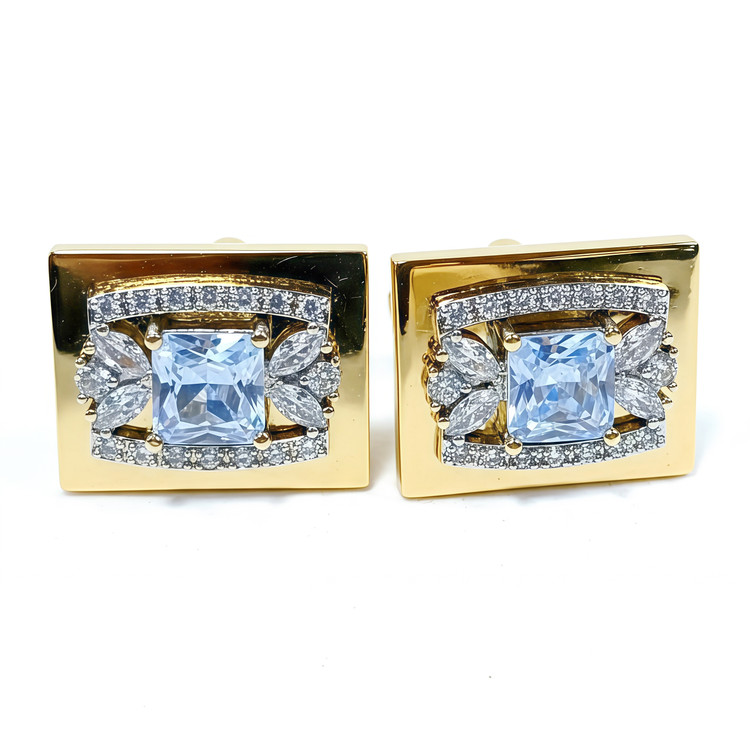 دکمه سردستهای مجلل با طراحی تاج پادشاهی، نمادی از قدرت و ظرافت بیهمتا. مرکز هر قطعه با یک کریستال آکوامارین مربعی (تراش پرنسس) احاطه شده و بالهای تاج با کریستالهای مارکیز سفید سواروسکی و هالهای از میکروپاوه درخشان تکمیل میگردد.