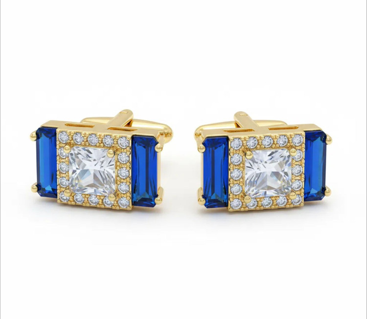 دکمه سردستهای سلطنتی با طراحی سهسنگه تاجدار، ترکیبی از یاقوت کبود آبی و زیرکونیای درخشان در هالهای از میکروپاوه سواروسکی. مرکز هر قطعه با یک زیرکونیای مربعی (تراش پرنسس) احاطه شده و دو یاقوت کبود مستطیلی (تراش بگت) در طرفین، عمق و شکوه جواهری ایجاد میکنند.