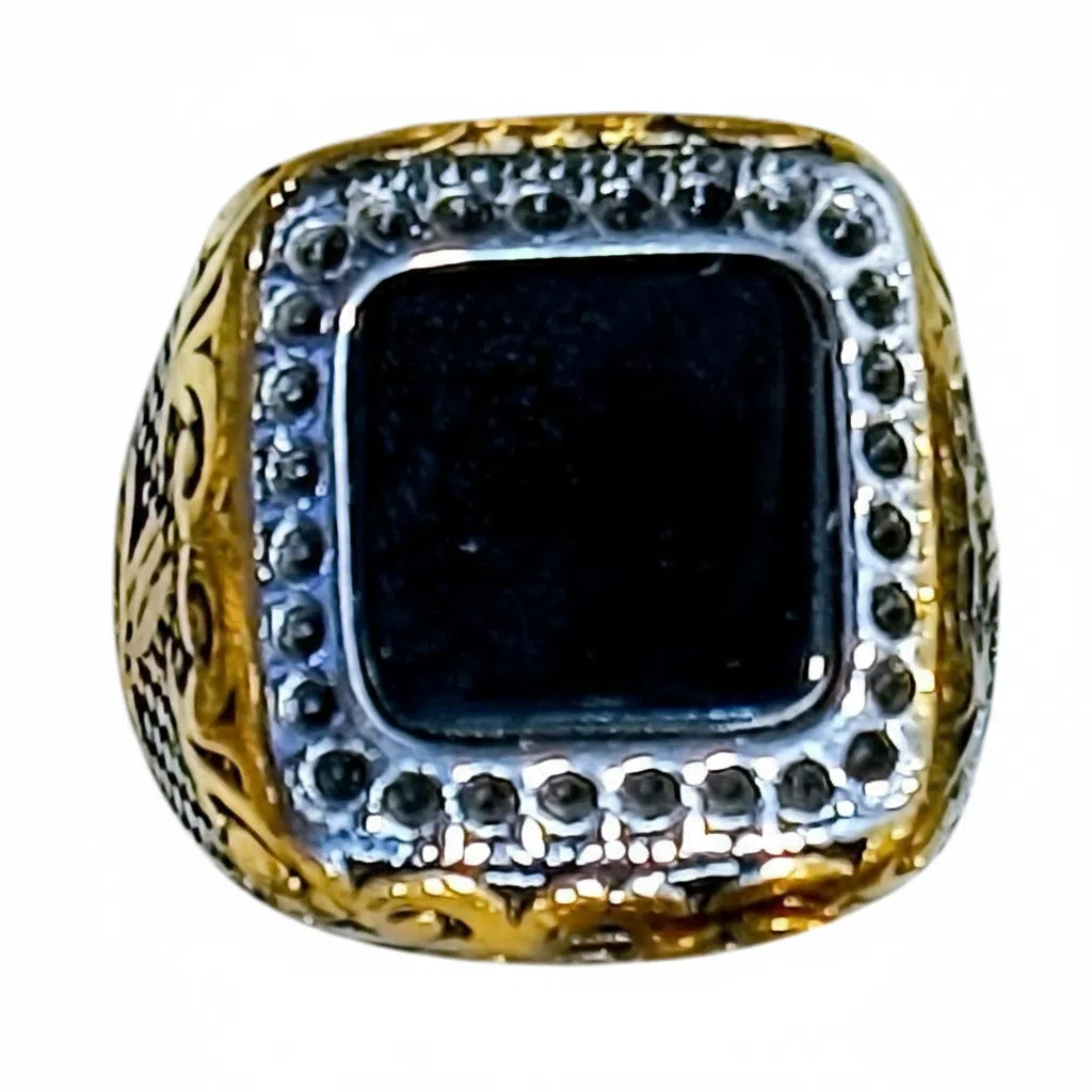 این انگشتر فاخر و پرجلوه با روکش دو رنگ (طلایی و پلاتین) ساخته شده و با یک عقیق سیاه طبیعی مستطیلشکل (onyx) در مرکز، ظاهری مرموز و قدرتمند دارد. صیقلخورده و براق، با قاب پلاتینی تزئینشده توسط الماسهای ریز پاوِه (pavé setting) احاطه شده که درخششی خیرهکننده ایجاد میکند.