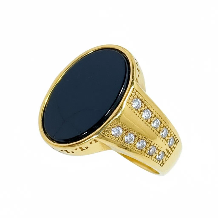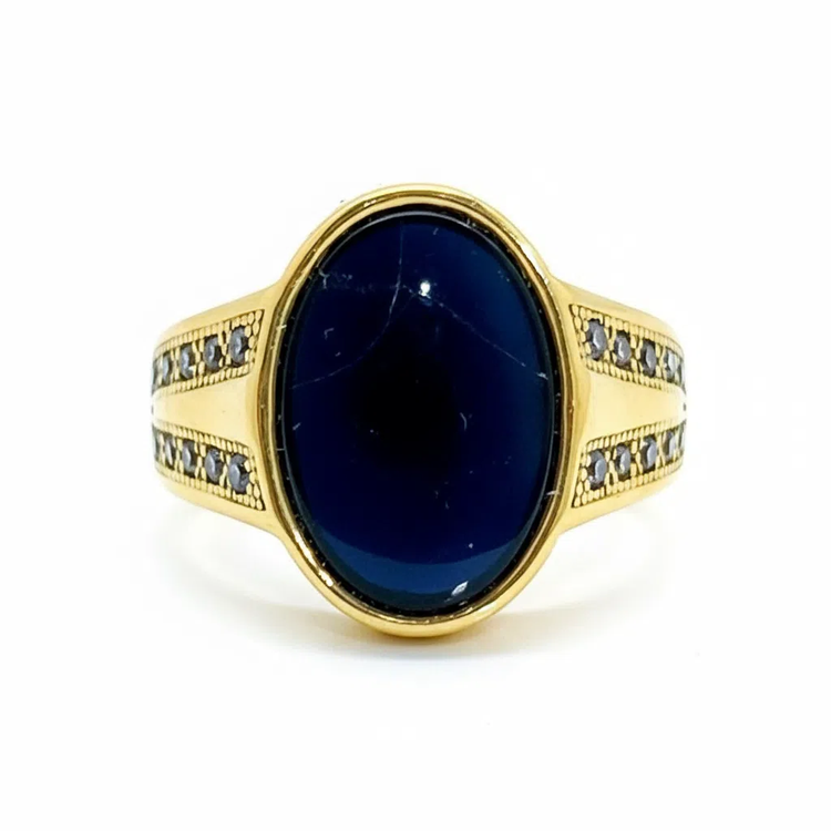 این انگشتر باشکوه و کلاسیک با یک عقیق آبی تیره طبیعی بیضیشکل در مرکز، عمق و رمزآلودی بینظیر دارد. سنگ اصلی با سطحی صاف و براق، در نور رنگ آبی شبتابی عمیقی را منعکس میکند.و دو طرف بدنه با ردیفهای الماس ریز پاوِه (pavé setting) در قابهای طلایی تزئین شده که کنتراست درخشانی با عقیق تیره ایجاد میکند. طراحی ساده اما قدرتمند، آن را به انتخابی ایدهآل برای استایلهای رسمی و روزمره تبدیل کرده است
