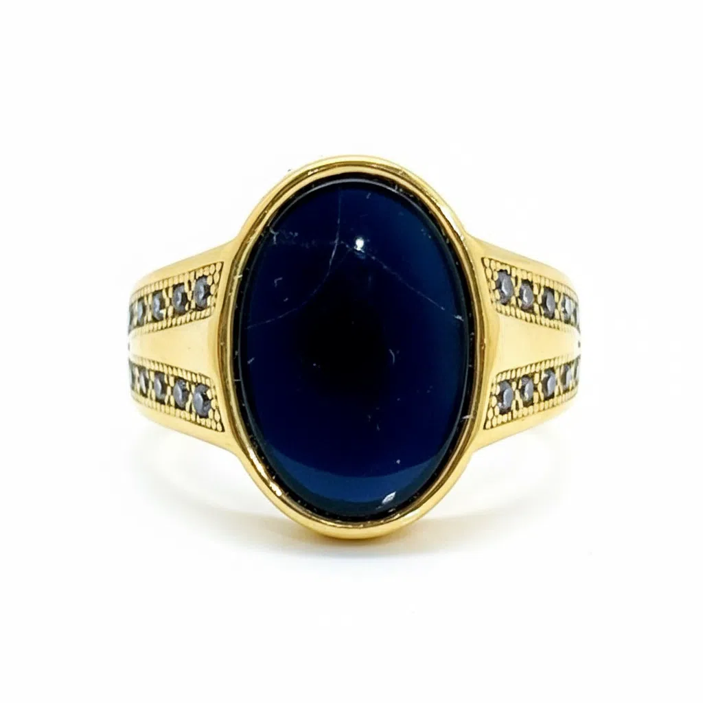 این انگشتر باشکوه و کلاسیک با یک عقیق آبی تیره طبیعی بیضیشکل در مرکز، عمق و رمزآلودی بینظیر دارد. سنگ اصلی با سطحی صاف و براق، در نور رنگ آبی شبتابی عمیقی را منعکس میکند.و دو طرف بدنه با ردیفهای الماس ریز پاوِه (pavé setting) در قابهای طلایی تزئین شده که کنتراست درخشانی با عقیق تیره ایجاد میکند. طراحی ساده اما قدرتمند، آن را به انتخابی ایدهآل برای استایلهای رسمی و روزمره تبدیل کرده است