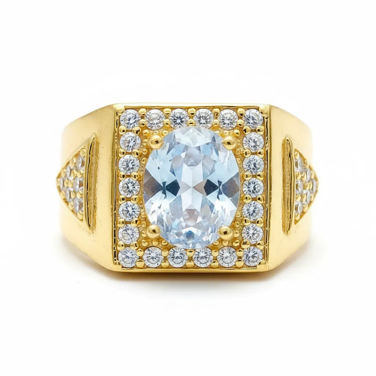 این انگشتر مجلل با سنگ مرکزی آکوامارین آبی شفاف (درشت و بیضیشکل) و حلقهای کامل از نگینهای زیرکونیا ریز اطراف آن، نمادی از آرامش، ثروت و اعتماد به نفس است. بدنه طلایی با طراحی هندسی و برجسته، جلوهای سلطنتی و مدرن به استایل شما میبخشد.