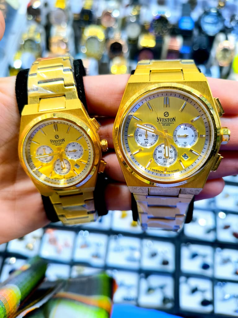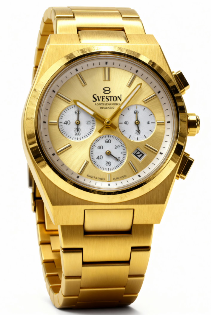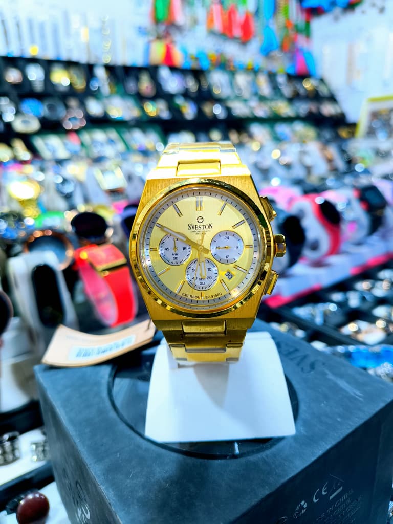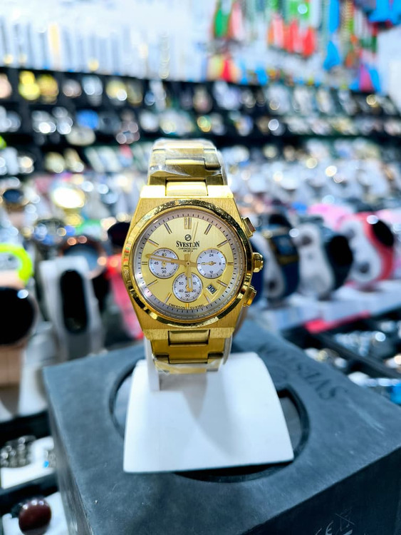 ✨ طلای واقعی در مچ شما! ساعت Sveston Emerson SV-9160 با طراحی تمام طلایی و صفحه شامپاینی، نماد قدرت، موفقیت و کلاس است. این ساعت کرونوگراف با جنبش ژاپنی دقیق، استیل ضدزنگ 316L و شیشه معدنی مقاوم، انتخابی بینقص برای آقایانی است که به جزئیات اهمیت میدهند.