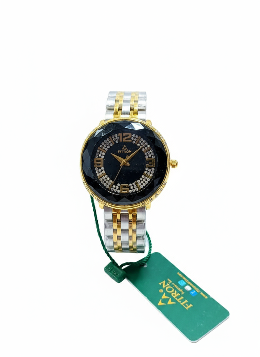 ساعت مچی زنانه Fitron 6239L با صفحه مشکی براق و حاشیه نگیندار کریستالی، ترکیبی بینظیر از لوکس، مد و عملکرد است.